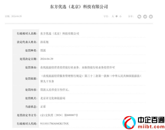 5月6日,據(jù)北京市文化市場綜合執(zhí)法總隊(duì)官網(wǎng)披露,東方甄選關(guān)聯(lián)公司東方優(yōu)選(北京)科技有限公司(以下簡稱"東方優(yōu)選")因在線旅游經(jīng)營者經(jīng)營旅行社業(yè)務(wù),未取得旅行社業(yè)務(wù)經(jīng)營許可,于4月29日被北京市文化和旅游局罰款1.3萬元。處罰依據(jù)為《在線旅游經(jīng)營服務(wù)管理暫行規(guī)定》第三十二條第一款和《中華人民共和國旅游法》第九十五條。