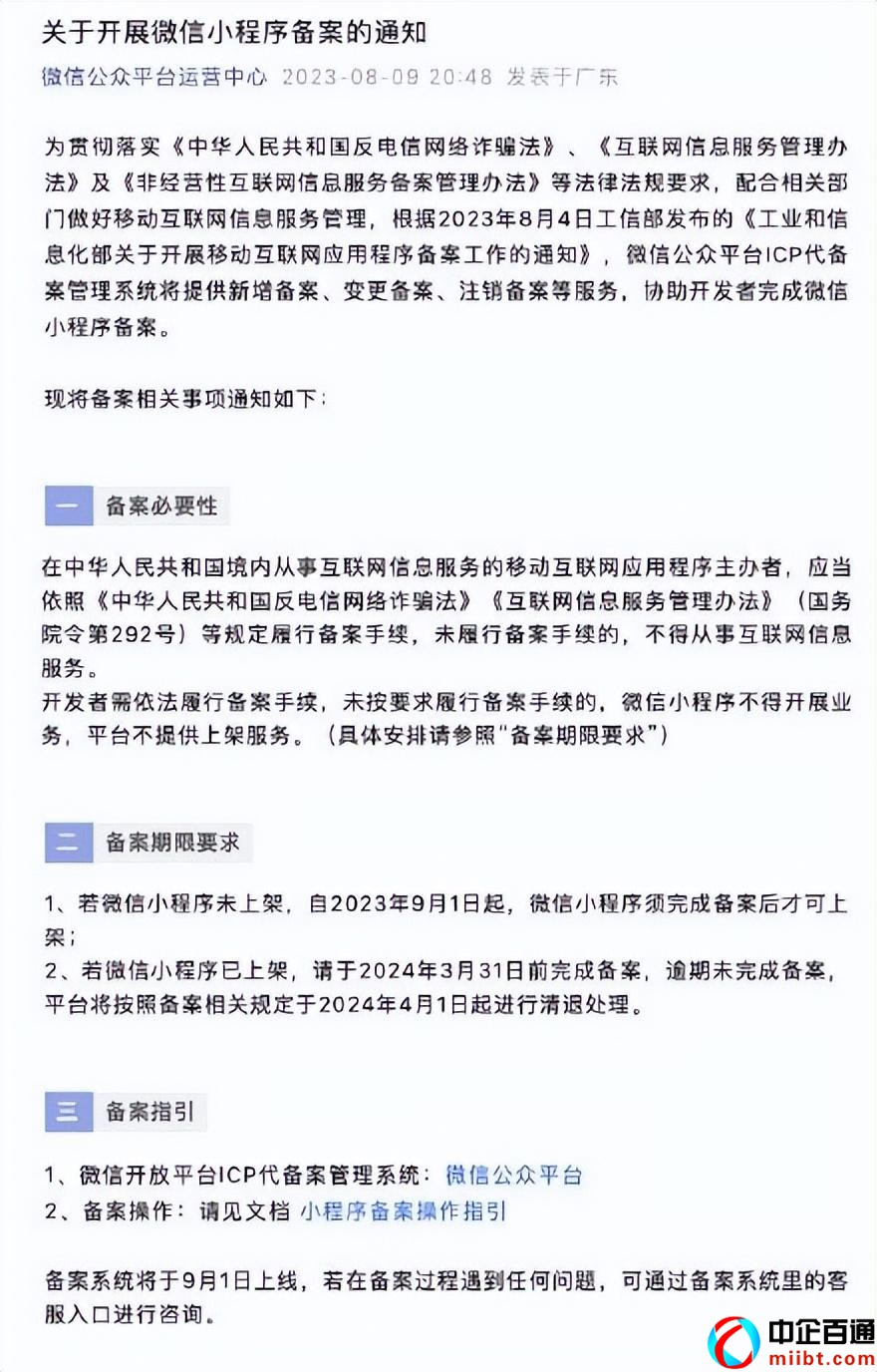 3、若微信小程序已上架,請于2024年3月31日前完成備案,逾期未完成備案,平臺將按照備案相關(guān)規(guī)定于2024年4月1日起進(jìn)行清退處理;