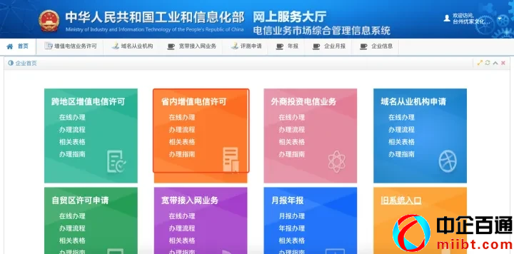 賬號(hào)注冊(cè)完之后,點(diǎn)首頁(yè)的行政許可,然后選電信業(yè)務(wù)經(jīng)營(yíng)許可,點(diǎn)在線辦理進(jìn)去。
