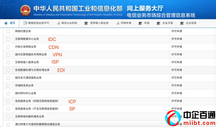 進(jìn)去點(diǎn)右上角的申請(qǐng),選著你要申請(qǐng)的增值電信業(yè)務(wù)經(jīng)營(yíng)許可證的類目,這里我給大家做了一部分標(biāo)注,方便大家查看。