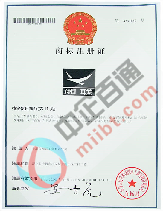 某公司第12類商標(biāo)注冊證書