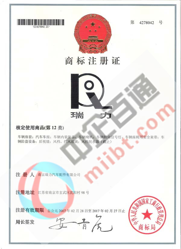 某公司第12類商標(biāo)注冊證書