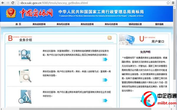 進入系統(tǒng)后,用戶可以看到主要功能:商標近似查詢、商標綜合信息查詢、商標狀態(tài)信息查詢、錯誤信息反饋、操作指南。