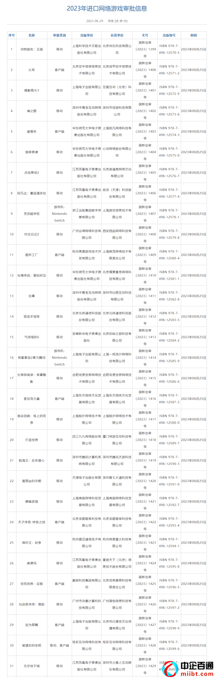 獲批版號的31款進(jìn)口游戲名單和2023年游戲?qū)徟兏畔⑷缦拢?/p>