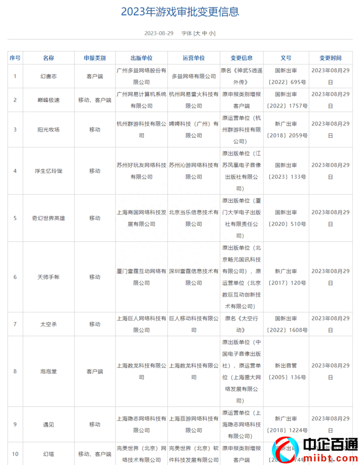 與此同時,國家新聞出版署還公布了10款游戲的審批變更信息。其中《泡泡堂》更換了出版與運營單位,完美世界《幻塔》、網(wǎng)易《巔峰極速》新增報了客戶端版本,多益網(wǎng)絡(luò)因知識產(chǎn)權(quán)糾紛將《神武5逍遙外傳》名稱改為《幻唐志》。