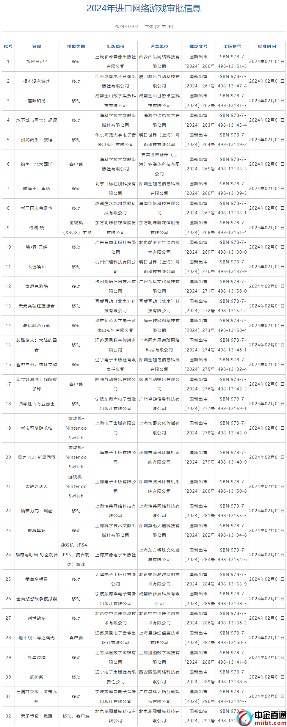 2月2日,2024年進(jìn)口網(wǎng)絡(luò)游戲?qū)徟畔⒄桨l(fā)布。據(jù)國(guó)家新聞出版署官網(wǎng)顯示,共32款游戲獲得游戲版號(hào)。